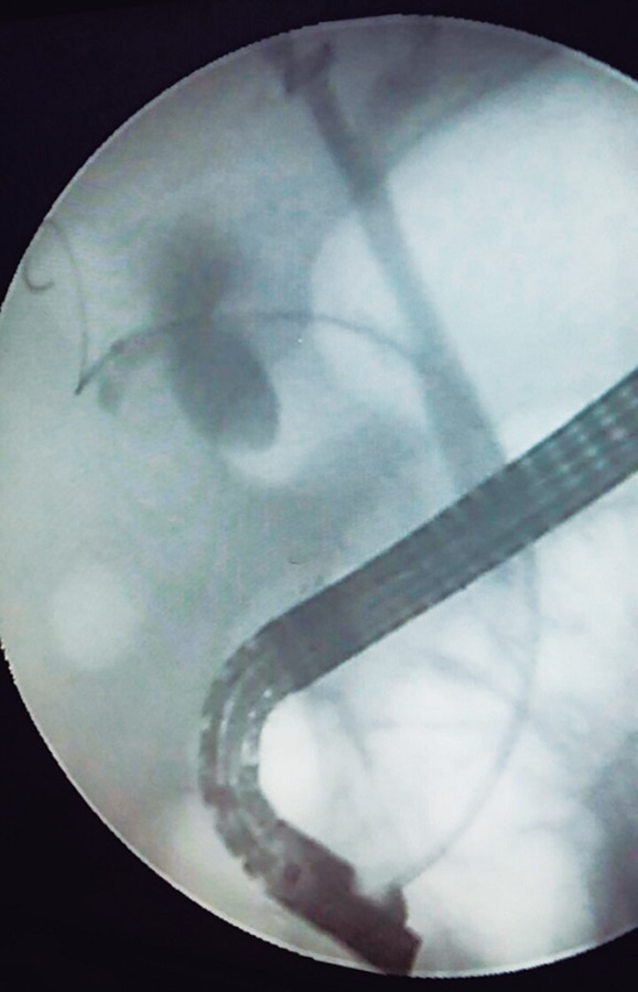Caso 1: Mujer de 19 años, cursando puerperio inmediato, que, a raíz de un accidente doméstico, sufrió quemaduras AB y B en cara, tórax y miembros, que comprometían el 20% de la superficie corporal total. Se realizaron curaciones locales, antibioticoterapia sistémica y toilette de lesiones cutáneas, con buena evolución. A las dos semanas presentó fiebre, taquicardia, taquipnea, insuficiencia respiratoria aguda e inestabilidad hemodinámica, por lo que requirió cuidados intensivos, asistencia respiratoria mecánica invasiva y vasopresores. Presentaba mala evolución, con disfunción orgánica múltiple y aparición clínica de ictericia. En la analítica se observó: hematocrito 29,6%; leucocitos 15750/mm3, NS 76%, NC 3%, L 20%, M 1%; plaquetas 99000/mm3, VSG 46 mm/1°hora, bilirrubina total 6,53 mg/dL; bilirrubina directa 5,54 mg/dL; TGO 34 UI/L, TGP 30 UI/L, FAL 564 UI/L, GGT 62 UI/L, amilasa 38 UI/L. En la ecografía abdominal se informó vesícula biliar con paredes en el límite de la normalidad y con litiasis múltiple en su interior. La vía biliar extrahepática se encontraba levemente dilatada, sin observarse imagen compatible con cálculo en esta. Debido a la condición clínica de la paciente y la sospecha de colecistitis aguda litiásica, se decidió realizar Colangiografía retrógrada endoscópica (CPRE).
