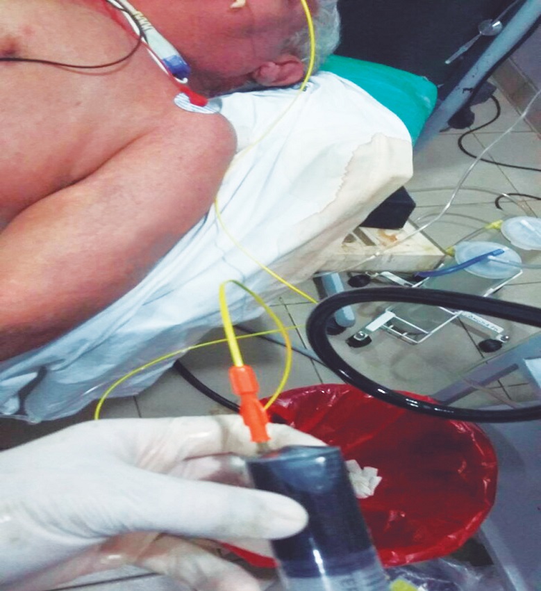 Se realizó procedimiento con endoscopio de visión lateral, en el que se observó la papila de aspecto normal. Se canuló selectivamente la vía biliar con un papilótomo y una guía. En la colangiografía, se evidenció la vía biliar levemente dilatada con lito a nivel del colédoco medio. Se realizó papilotomía observándose salida de bilis clara. Se extrajo un lito con balón. Se canularon el conducto cístico y la vesícula (Figura 5). Se dejó el drenaje nasovesicular (Figura 6), se aspiró bilis para cultivo y se indicaron lavados reglados (Figura 7).