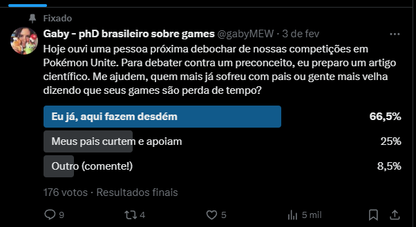 1 Traducción libre del texto del tweet: “Hoy escuché a alguien cercano burlarse de nuestras competiciones en Pokémon Unite. Para enfrentar este prejuicio, estoy preparando un artículo científico. ¿Podrían ayudarme? ¿Quién más ha tenido que soportar comentarios de padres o personas mayores diciendo que sus videojuegos son una pérdida de tiempo?”