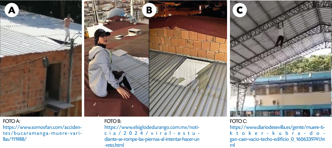 Como se detalla en las fotos A y B de la figura, los jóvenes tuvieron un fatal accidente cuando se les rompió el techo al caminar por el –al interactuar con la realidad–, pues su percepción-aprendizaje-interacción con la realidad ha generado una comprensión pauperizada de la misma, que más allá de buscar llamar la atención a través de redes sociales, los eventos accidentados ocurren por su conexión debilitada con la realidad, pues entienden la realidad desde sus PAIPC. Razón por la cual no comprenden que existen variedad de tipos [structure] de techos, donde muchos de estos no son actos para soportar el peso humano, pues solo los perciben-aprenden-interactúan como shape. El caso de la foto C donde el joven también sufre un grave accidente, se comprende bajo la misma dinámica, donde niños y jóvenes “formados” bajo las dinámicas de PAIPC de videojuegos, en la cual los avatares no se cansan, y donde una caída desde esa altura no manifiesta un real daño grave. Lo que demuestra un conocimiento de su cuerpo y de la realidad muy empobrecido generado por una interacción muy escaza con la misma, llevando al joven a realizar un acto que las generaciones anteriores –dados sus PAIPC muchísimo más complejas y prósperas– jamás habrían realizado.