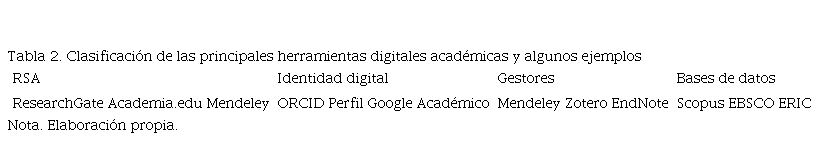 La influencia de las RSA ha dado lugar a parámetros como la altimetría, que abarca no solo las métricas arrojadas por las RSA, sino también las de otras herramientas digitales presentes en Internet. Las principales RSA son ResearchGate, Academia y Mendeley (Campos et al., 2014). Es necesario diferenciar, entonces, las herramientas digitales académicas que se encuentran disponibles en la web para identificar a las RSA. Recordemos que la principal característica de éstas es que deben permitir la interacción social. A partir de ello podríamos clasificar las diversas herramientas en: RSA, identidad digital, gestores de referencia y bases de datos científicas, entre las principales herramientas digitales académicas para la obtención de recursos y materiales científicos en línea (Tabla 2).