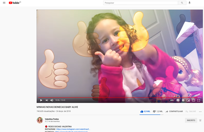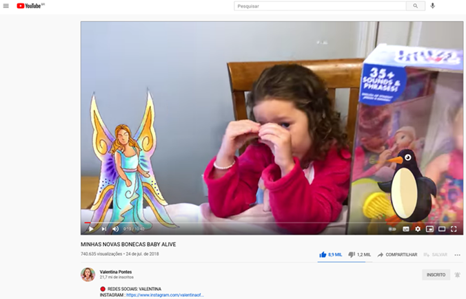 Debido a que fue producido antes de las nuevas regulaciones impuestas por la plataforma para contenidos infantiles, el video de Valentina Pontes aún solicita feedback de los más pequeños para sugerencias de nombres para las muñecas presentadas en los comentarios del canal. Existe, en varios momentos de la pieza, la estrategia de solicitar likes e suscripción al canal, lo que funciona como una estructura comercial básica dentro del discurso de este tipo de video, objetivando, naturalmente, impulsar a la audiencia dentro de la plataforma. Destacamos que, durante la exhibición, también existe un impulso a la presencia de esta influenciadora en otras plataformas de redes sociales, como Instagram. Según Tomaz (2019).