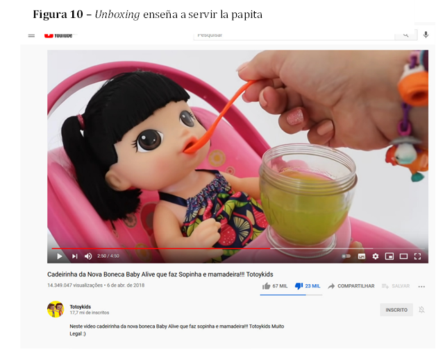 Así, las muñecas mostradas por la influenciadora tienen un perfil muy tecnológico, si comparadas a las demás. El nombre “Baby Alive” [Bebé Vivo] nunca ha tenido tanto sentido. Las muñecas “comen, orinan y hacen caquita”, lloran lágrimas “de verdad”, se enferman e interactúan con los niños, en diversas opciones de guion para hablar, dirigiéndose a la madre, al padre o a cualquier otra figura (que podría ser el médico, por ejemplo). En este punto, vemos una innovación: los padres de la influenciadora, motivados por las novedades de los juguetes, se involucran demasiado en los juegos. Para Ronsini (2010, p. 9),