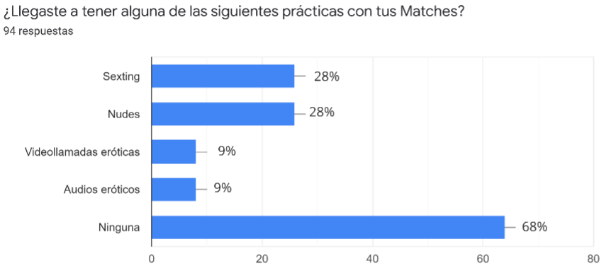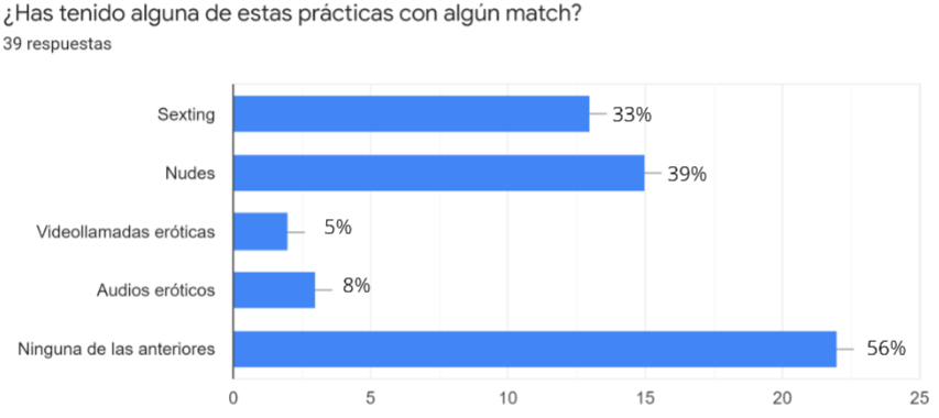 De las respuestas válidas resultó que un 42% nunca ha utilizado alguna dating app; un 39.1% las utilizó pero actualmente no las usa y un 18.9% que sí las sigue utilizando. De las 93 personas que dejaron de usar la aplicación, se encontró que un 54.8% las dejó de usar hace seis meses o menos; un 30.1% hace un año, un 12.9% hace dos años y sólo un 2.2% hace tres años o más. Por otra parte a las 45 personas que afirmaron usar actualmente alguna aplicación se les preguntó por el tiempo que llevan usándolas y se registró que un 44.4% las ha usado durante seis meses o menos, que un 26.7% durante un año, que un 15% durante dos años y sólo un 13.3% durante tres años o menos.