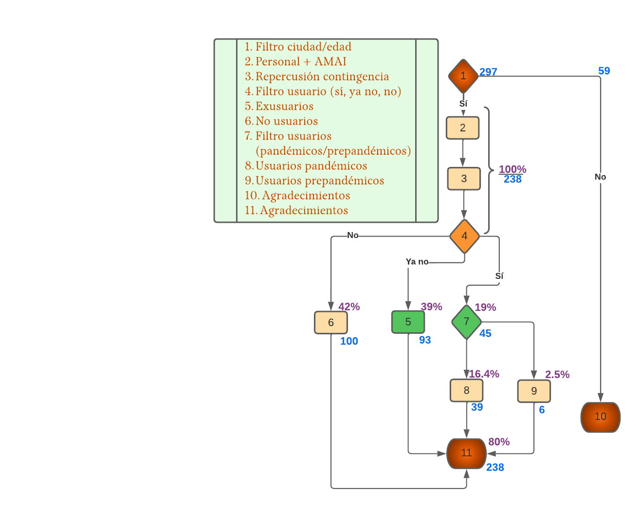 Una primera ruta definida en la encuesta está dirigida a usuarios que actualmente ya no utilizan dating apps. En esta ruta aparecen preguntas como las siguientes: ¿en qué momento del día utilizaban la o las aplicaciones para citas?, ¿cuándo dejó de utilizar las aplicaciones para citas?, ¿qué motivos tuvo para dejar de usar las aplicaciones?, ¿cuál fue la experiencia de uso de las aplicaciones para citas? La segunda ruta está planteada para personas que nunca utilizaron las aplicaciones para citas. En este caso se definieron preguntas como las siguientes: ¿Le gustaría usar alguna aplicación para citas? ¿bajo qué circunstancia descargaría una aplicación para citas? ¿qué percepción tiene sobre la gente que usa aplicaciones para citas? Una tercera ruta tercera ruta está definida para usuarios que descargaron una o varias aplicaciones para citas durante la pandemia. En esta situación particular se abordaron preguntas como las siguientes: ¿por qué descargaron una o varias aplicaciones para citas durante la pandemia?, ¿para qué utilizaron las aplicaciones para citas durante la pandemia?, ¿qué experiencia obtuvieron con el uso de aplicaciones para citas? La última ruta se desarrolló para usuarios que utilizaban, desde antes de la pandemia, las aplicaciones para citas. Las preguntas que se plantearon en esta ruta fueron muy similares a la ruta anterior, con algunos ajustes para diferenciar entre el uso anterior y el actual.