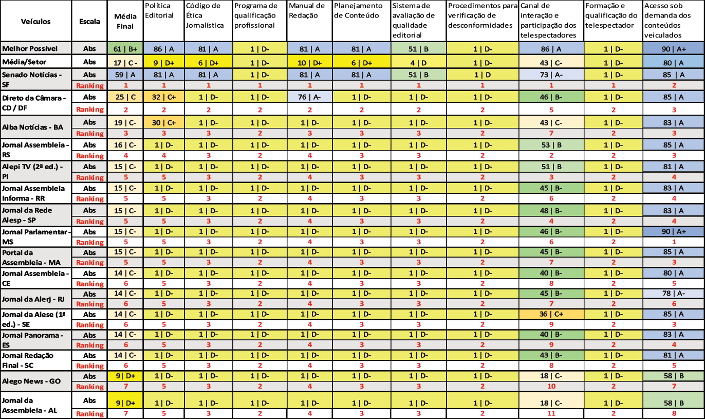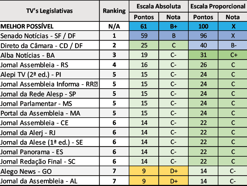 O resultado da avaliação apontou um cenário de pouca transparência e adoção de boas práticas de gestão editorial nas emissoras legislativas avaliadas em relação à sua produção jornalística. A nota média do conjunto das emissoras foi, na escala absoluta, foi 17 (C-) e, na escala proporcional, 28 (C), ambas muito distantes da emissora que liderou o ranking, evidenciando a lacuna que há entre esta e o grupo majoritário de emissoras legislativas.