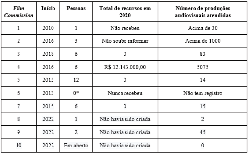 oO intervalo entre 2010 e 2022 contempla o tempo de início das film commissions pesquisadas. As equipes de trabalho foram consideradas pequenas, com variação de 1 a 12 pessoas, o que se alinha à média das equipes de film commissions estrangeiras (Körössy & Santos, 2022).