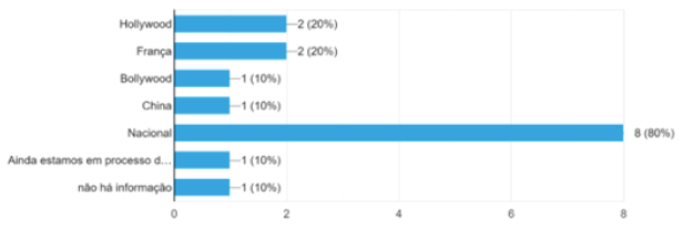 As entidades pesquisadas afirmaram que o mercado nacional é seu público alvo prioritário. Já Hollywood e França foram mencionados duas vezes e China e Bollywood, uma vez pelos respondentes.Ainda sobre a captação de produções audiovisuais, tem-se filmes, séries, documentários e vídeos publicitários considerados como as produções de maior interesse para serem captadas, e programas de viagens também foram mencionados por três comissões.
