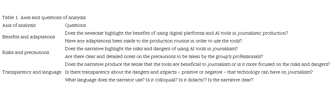 It is therefore understood that the newscast explores the benefits of using AI tools in the production routine, and gives examples of how the process could be streamlined and made more efficient but does not mention which tools are in use or could be used in the future. There is also no detailed indication of the adaptations that have taken place or could take place in journalists' routines to adapt to the tools; after all, many professionals still don't know how to use artificial intelligence or don't have the time to learn on their own in the midst of a hectic newsroom routine.
