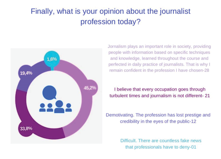 However, more negatively, about 19.4% of respondents see the profession as demotivating and that it has been losing prestige and credibility in the eyes of public opinion. On the other hand, 1.6% consider it difficult to be a journalist nowadays, as there are countless fake news that professionals have to deny, among other reasons.