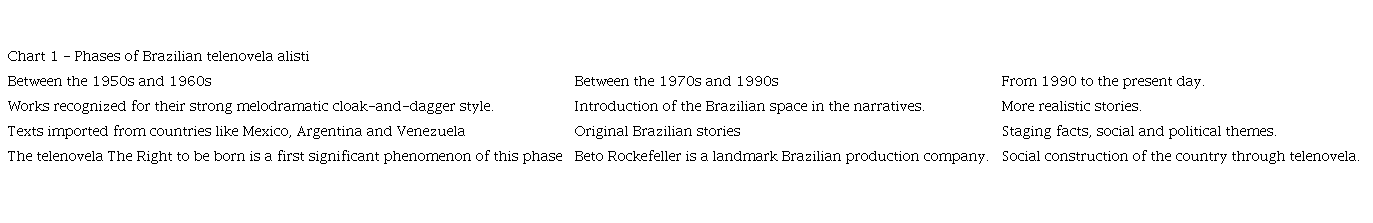 The trajectory of the Brazilian telenovela began in 1951 on TV Tupi, with the production Your life belongs to me/ Sua vida me pertence. The story chronicled a couple's life and was shown twice a week (Alencar, 2004). The conventions of fiction in Brazil originate from plots based on radio soap operas and Cuban cigar factories, which were influences on the creation of American soap operas (Alencar, 2004). Lopes (2014) divides Brazilian telenovelas into three phases, each of which is outlined in the table below: