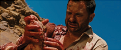 She finds him in the middle of the desert, and, at that moment, he becomes her prey. With a rifle, the hunt begins, and after being shot in the shoulder, Stan runs, crying, and even drools. Fargeat reverses gender stereotypes and makes the male character show pain and suffering, presenting his gestures in the most intense way possible. It intensifies when Jen breaks a glass, and the man steps. The viewer can experience through its limits the representation of pain: Stan tries, numerous times, to remove a massive shard of glass that is in a pulsating cut on his foot until he is later killed.
