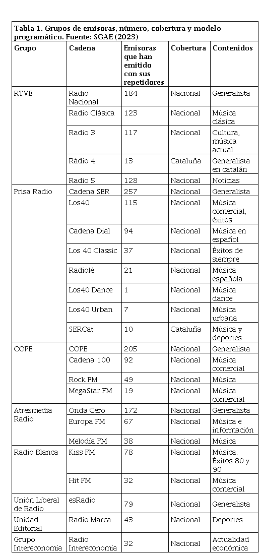 Sin embargo, este trabajo no abarca la totalidad de las emisoras de radio activas en España. La muestra se limita a los grandes grupos con mayor número de emisoras, excluyendo emisoras autonómicas, locales o de menor alcance, como Radio María o RAC1. Asimismo, no se incluyen las emisoras exclusivamente online, ya que el objeto de estudio se centra en el sistema mediático tradicional de radio emitida a través de ondas hertzianas.