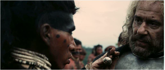 Antón/Colón presenta a Daniel/Hatuey el cascabel a llenar de oro como impuesto (También la lluvia, Morena Films, Paramount Pictures, 2010).