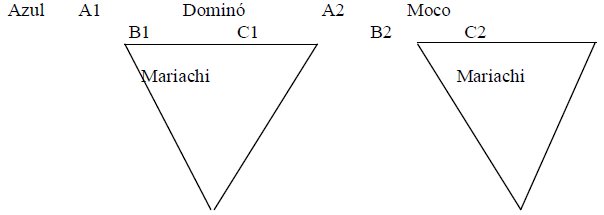 De hecho, Dominó se instituye en el vértice que rompe la concepción dicotómica generando relaciones triangulares como nexo entre Moco, Azul y el mariachi. Visualmente, ello se dispone como recojo en el siguiente: