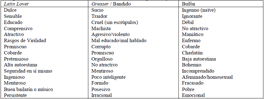 Éste, como contrapartida de la payasa latina, es desautorizado y ridiculizado constantemente. Se presenta como herramienta fílmica con la que desarticular la tensión sexual del Latin lover y la híper-masculinidad amenazante que semantiza el bandido. Además, la función principal de este estereotipo es la de proveer al filme momentos de humor anticlimáticos. Nótese que en este filme no hay rastro de la payasa como contrabalanza frente a los estereotipos aguerridos y sexuales que amalgama Dominó. Sin embargo, es el mariachi quien también asume ciertos rasgos del bufón en su caracterización infantilizada. Por lo tanto, la dosis del cuerpo latino como vía de liberación de tensión argumental está servida. A partir de los tres estereotipos masculinos anteriores (Latin lover, Greaser, Bufón), se constituyen las bases de las variantes de la representación latina en el cine estadounidense. Si nos atenemos a sus componentes semánticos internos, tal como observamos en el siguiente cuadro, destaca el hecho que la inmensa mayoría de elementos que delimitan la caracterización de los personajes latinos son negativos per se: