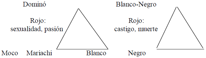 Resáltese que Dominó muere vistiendo una camiseta blanca y unos pantalones negros, en clara alusión simbólica de su posición entre el mariachi y Moco. Sus labios rojos y su sangre manifiestan el tercer color como representación de pasión y muerte, respectivamente. De forma visual, ello queda ilustrado por el siguiente “Diagrama 2 de policromía estructural simbólica:”