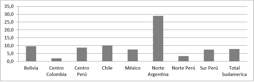 Sin embargo, estas redes mercantiles estaban mejor organizadas y manejaban volúmenes de comercio mayores: “En una sola transacción un comerciante de Buenos Aires manejaba una suma equivalente al total de importaciones de un comerciante antioqueño de la elite durante todo el año”57. Adicionalmente, esto se verifica en la participación de los impuestos al comercio en el total recaudado para algunas regiones de la América española (ver gráfico 2), en el cual la región central de la Nueva Granada apenas llega a un 2% (inferior al 8% correspondiente al total sudamericano), nivel similar al alcanzado en el norte del Perú, pero ampliamente superado por el comercio del norte de Argentina y México, y por la totalidad de Bolivia y del centro y sur peruanos58, donde la minería y el comercio fueron sectores más dinámicos.