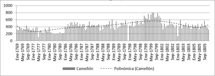 Para el mismo año se comerciaron 19.300 cargas de productos locales, de las cuales casi tres cuartas partes consistían en mercancías de tierra caliente cuyas entradas se registraban en el ramo de camellón, o derechos de peaje, como melazas, mieles y alfandoques, que representaba 13.900 cargas. El valor del pago de camellón por las cargas de mercancías que entraron y salieron de Santafé entre 1769 y 1805 fue creciente, lo cual sugiere un comportamiento similarmente creciente de las introducciones legales de mercancías locales e importadas a Santafé83. En el gráfico 3 se muestra el valor del pago de camellón por las cargas de mercancías que entraron y salieron de Santafé entre 1769 y 1805, serie que muestra un aumento en la comercialización de dichos bienes en la ciudad, a juzgar por el crecimiento del 3% anual promedio que experimenta el pago de camellón a partir de 1777 hasta el primer año del siglo XIX.