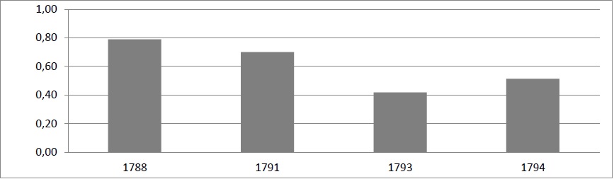 Por otra parte, se encuentran las pulperías, distribuidas en todos los barrios de la ciudad, en las cuales se comercializaban alimentos, productos de mercería, buhonería y droguería, pero a diferencia de las tiendas de trato no se vendían paños o algún tipo de tejido y se vendía licor para su consumo en el lugar. Tanto las tiendas como las pulperías se encontraban reguladas por el cabildo y la junta municipal de propios, y debían pagar alcabala y otros cargos fiscales de acuerdo con sus ventas. Mientras que las tiendas pagaban 10 pesos en promedio, las pulperías pagaban 6 pesos, los cuales podían amortizar en tres pagos anuales. En el Gráfico 4 se puede apreciar el pago de derechos de alcabala por parte de los pulperos, como proporción del recaudo total, entre 1788 y 1794. La participación del pago es relativamente baja y no supera el 1%, además es decreciente, lo cual se explica por el mayor crecimiento de los otros ramos que componen el recaudo de este impuesto.86 Además, comparado con otras ciudades coloniales, las ventas en las pulperías neogranadinas a principios del siglo XIX fueron bajas: “Al finalizar el período colonial, las rentas del derecho de pulperías sumaban lo siguiente al año: Venezuela, 30.000; Nueva Granada, 6.000; Quito, nada; total, 36.000.” 87 En términos per cápita esto equivalía a 41,8 pesos para Venezuela y 4,8 pesos para la Nueva Granada, teniendo en cuenta los datos de población de Maddison88.