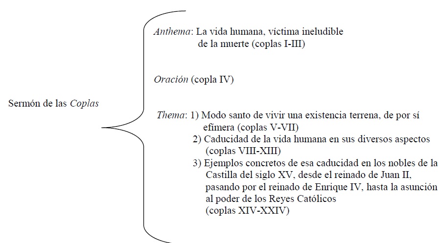 El poeta de las Coplas, cual predicador, organiza las primeras 24 estrofas bajo el esquema antes visto: antethema, oración y thema,9 para destacar el rol destructor del tiempo, de la fortuna y la muerte. El antethema comprende las coplas I-III; la oración, la copla IV; y el tema, las coplas V-XXIV. Pero, ayudados por las divisiones que de las Coplas hicieron Vicente Beltrán y María Dolores Royo La Torre, veamos el siguiente cuadro sinóptico del sermón del poema: