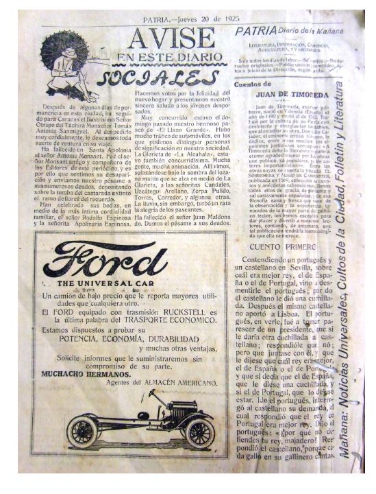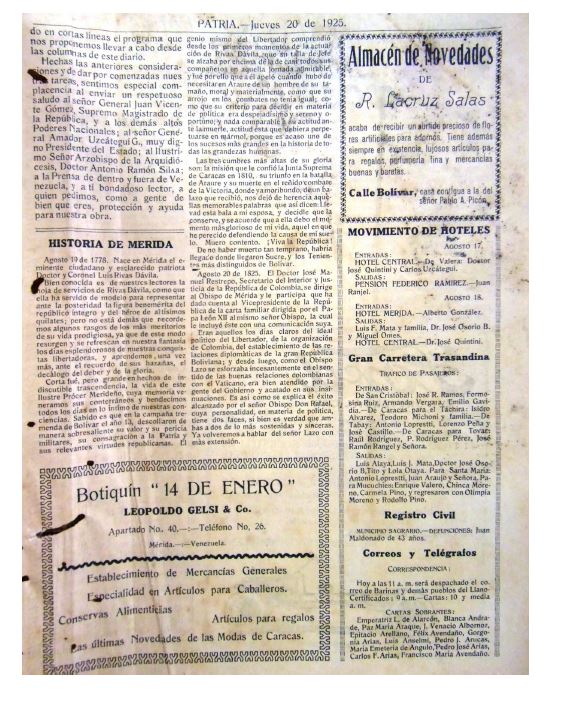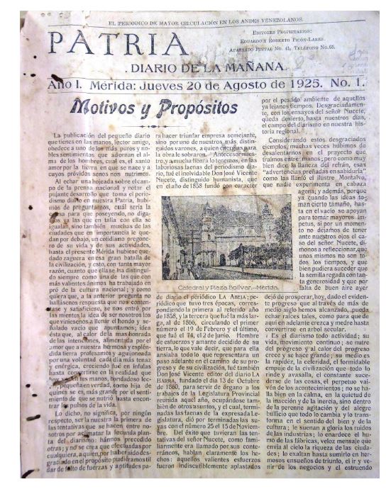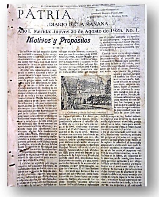 El primer ejemplar del DIARIO PATRIA. Diario de la mañana, circuló el jueves 20 de agosto de 1925. Y se enfocó principalmente en dar a conocer los motivos y propósitos de este “pequeño diario” (cuatro páginas). Asimismo, a través de su artículo central, estableció una mirada heroica a la historia de Mérida, siendo esta una forma de acercamiento entre la historia local y la historia oficial nacional. Por supuesto, como se hacía entonces, los artículos principales estuvieron acompañados de información de interés comercial y agrícola, así como de literatura, avisos, variedades y notas publicitarias de la época. Cabe destacar que la primera plana de este Diario, estuvo identificada por una agraciada fotografía de la Catedral y Plaza Bolívar de Mérida, donde se asomaban los merideños que transitaban por las calles de la urbe emeritense, teniendo como telón de fondo la magnificencia de la cordillera de los Andes. Sin duda, una estampa representativa de la ciudad que concebía aquella iniciativa hemerográfica. Actualmente, el acucioso investigador puede consultar en formato impreso y digital este Diario en los espacios de la Sala de Periódicos de la ULA, y recorrer, a través de sus páginas, una parte de la historia del occidente venezolano, misma que aún aguarda por investigadores comprometidos que escudriñen con mayor determinación la historia no revelada de los Andes.