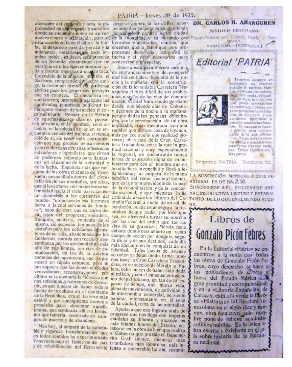 En la ciudad de Mérida, durante el siglo XX, circularon un conjunto importante de órganos divulgativos depositados en los fondos documentales estadales. En este caso, la Sala de Periódicos . Hemeroteca de la Biblioteca Central de la Universidad de Los Andes, resguarda y tiene para el acceso al público un total de 450 ejemplares del DIARIO PATRIA. Diario de la mañana, el cual estuvo en circulación entre el 20 de agosto de 1925 y el 31 de marzo de 1927, gracias a la labor emprendida por los editores Eduardo y Roberto Picón Lares. Estos ejemplares, representan en buena medida el alcance que tuvo la labor intelectual y comunicacional de los merideños en aquellos años, y sirven de fuente para los investigadores interesados en escudriñar el escenario político-económico y socio-cultural andino en su amplitud fenoménica.