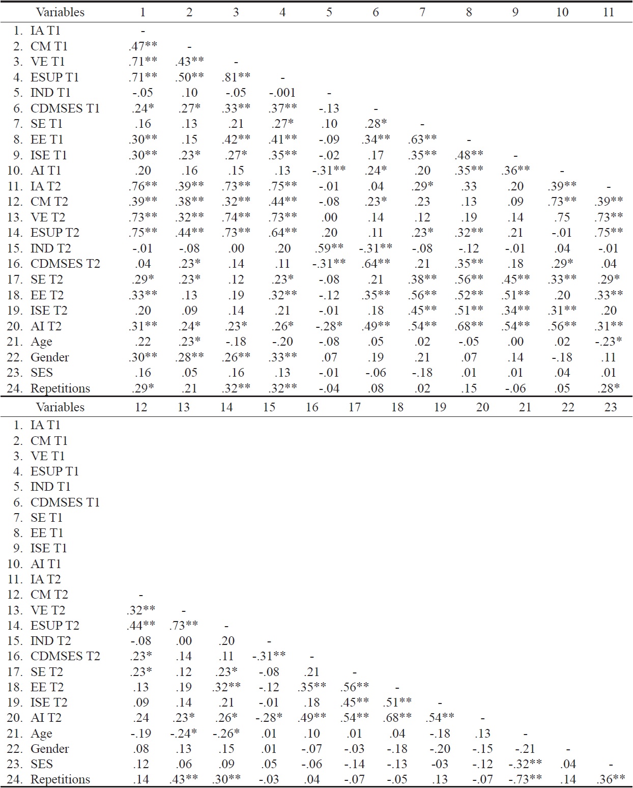 At T1, bivariate correlation analysis presented in Table 1 shows that older students and students with higher repetition rates perceived more parental support regarding Career-Related Modeling (r = .23, p < .05). Girls perceived more parental support than boys in the four dimensions of the CRPSS, as suggested by the positive correlations observed. Students without repetitions reported higher levels of parental support: Instrumental Assistance (r = .29, p < .01), Verbal Encouragement (r = .32, p < .01) and Emotional Support (r = .32, p <.01). According to the results, there was not any association between vocational variables and socioeconomic status. We can also observe that there were significant results found between adolescents' career decision-making self-efficacy and perceived parental support variables: Instrumental Assistance (r = .24, p < .05), Career-Related Modeling (r = .27, p< .05), Verbal Encouragement (r = .33, p < .01), and Emotional Support(r = .37, p < .01). Similarly, the exploration variables (Self-Exploration, Environmental Exploration, Intentional Systematic Exploration, and Amount of Information) showed significant results with the latter variables mentioned above — perceived parental support variables, with highest correlations between Environmental Exploration and Verbal Encouragement (r = .42, p < .01) and Emotional Support (r = .41, p < .01), and between Intended-Systematic Exploration and Emotional Support (r = .35, p < .01). Still at T1, career decision-making self-efficacy correlated significantly and positively with participants' Self-Exploration (r = .28, p< .05), Environmental Exploration (r = .34, p < .01) and Amount of Information (r = .24, p < .05).
