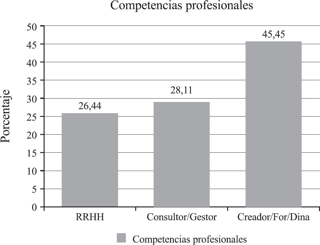 Centrando el interés en las competencias requeridas en las ofertas de empleo hay que resaltar que el perfil profesional con mayor porcentaje de competencias demandadas es el de Creador/dinaminador/formador, como se puede apreciar en la siguiente gráfica (Figura 2).