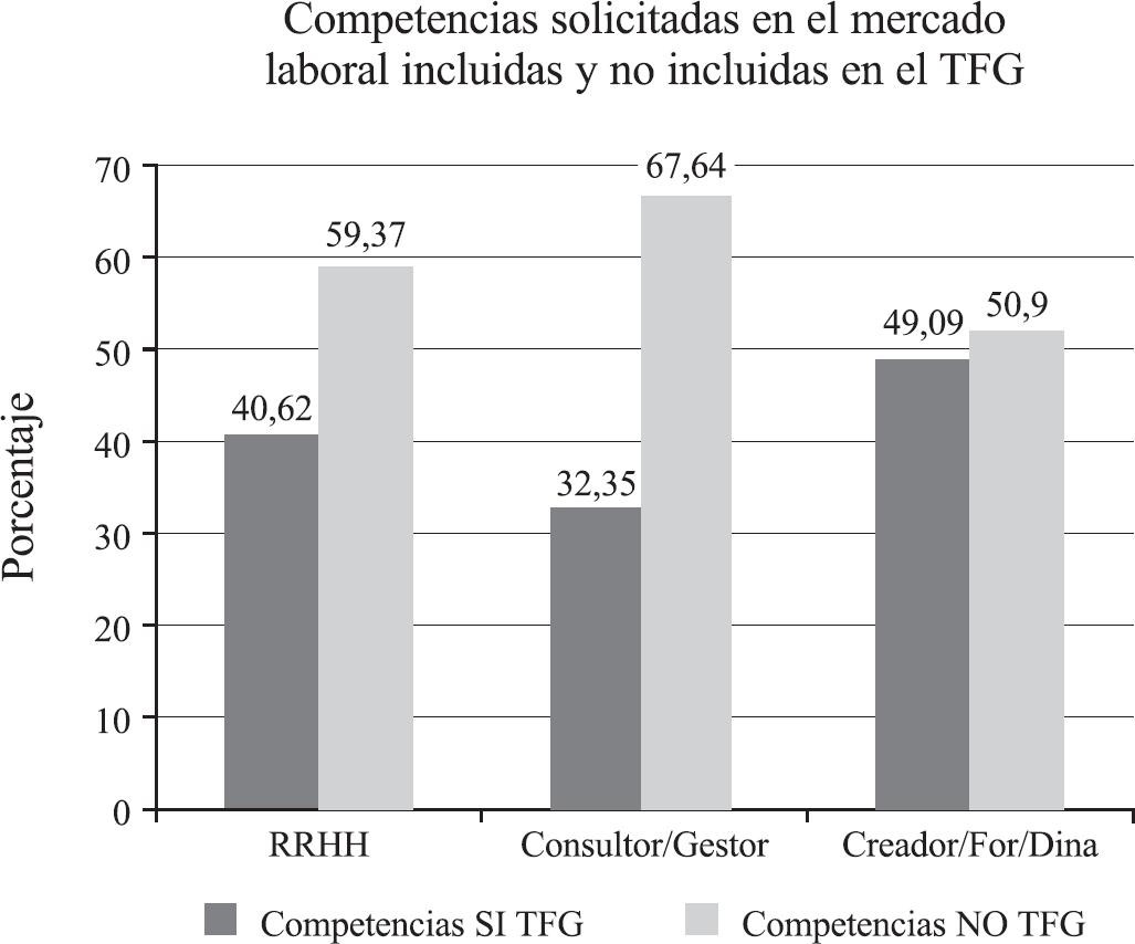 Tras revisar las ofertas laborales del mercado en el año 2013 en ellas se solicitan a los aspirantes un total de 121 competencias profesionales, mientras que en el TFG las competencias formativas que el alumnado debe conseguir ascienden a un total de 13. Es de resaltar que las competencias solicitadas por el mercado laboral real y aquellas otras exigidas en la formación inicial difieren en un alto grado de especificidad, siendo las competencias solicitadas en las ofertas laborales mucho más específicas que las competencias que se debe adquirir con el TFG. Por este motivo al realizar el análisis comparativo, en ocasiones, varias competencias de las solicitadas por las ofertas laborales se han incluido dentro de una sola competencia del TFG.