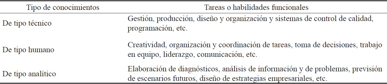 La transformación de los procesos productivos no sólo requiere de equipos y tecnología, sino también de nuevas formas de capacitación y desarrollo de los trabajadores/as (Almada, 2000). Un estudio realizado por la Comisión Europea –Fundación Tomillo (1999) en el contexto europeo destaca que los principales requerimientos de habilidades y destrezas demandas a los trabajadores/as se pueden sintetizar en tres grupos: (a) técnicos, (b) humanos y (c) analíticos. A continuación se muestran, en la siguiente tabla, las tareas que se demandan en cada uno de ellos: