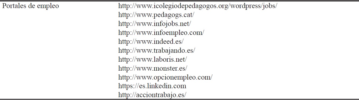 Para la búsqueda de ofertas laborales se han empleado portales de empleo de Internet, puesto que según el estudio realizado por Ruiz de Miguel y Barrera Trujillo (2013) la gran mayoría de los Pedagogos/as acceden al mercado laboral por medio de las búsqueda en portales de empleo on line. Los portales de empleo que se han revisado han sido seleccionados teniendo en cuenta sí incluían ofertas laborales para este profesional. A continuación se muestran dichos portales de empleo: