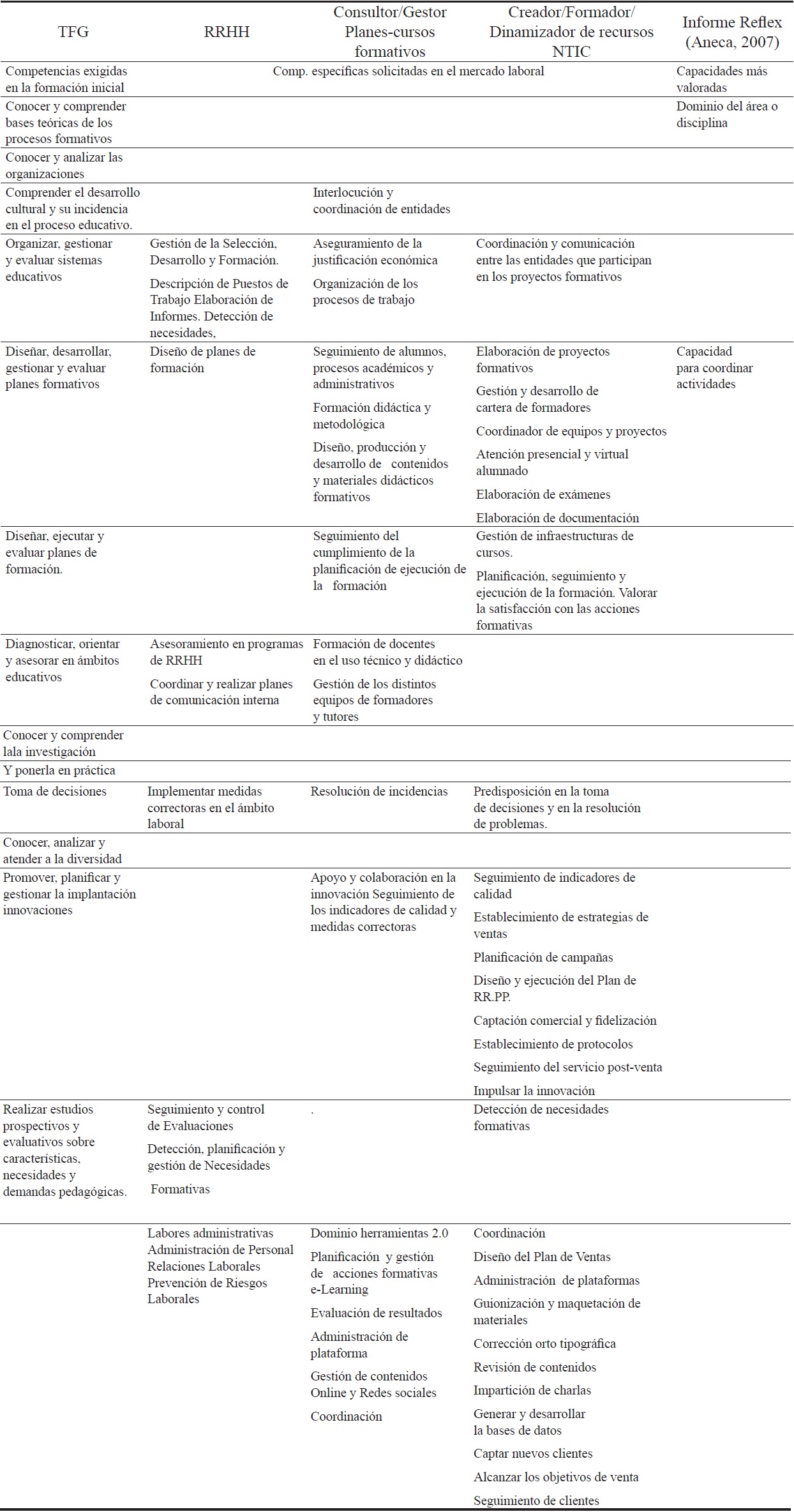 El resultado de dicha matriz se ha comparado con las competencias establecidas en la asignatura TFG del grado de Pedagogía de la Universidad de Málaga, así como con las capacidades más valoradas por el mercado laboral según el Proyecto Reflex, para los profesionales de la educación. Hay que aclarar que en la programación oficial de la asignatura no se indican competencias específicas propiamente dichas, sino que se incluyen directamente las competencias generales, por ello, en el análisis se han comparado las competencias específicas y transversales de cada perfil profesional con dichas competencias generales. De esta forma se ha intentado identificar si las competencias generales de la asignatura TFG incluyen, de alguna manera, las competencias solicitadas en la oferta laboral real, así como las capacidades establecidas por el informe Reflex.
