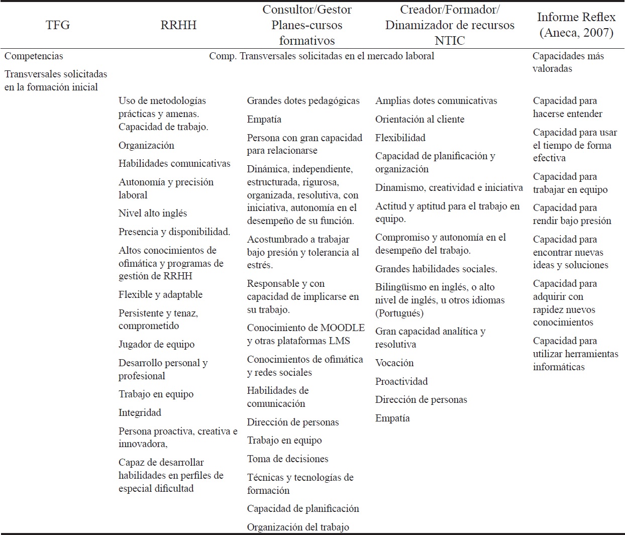 Hay que partir de la idea, que plantear en torno a qué y de qué manera debe configurarse la formación inicial de futuros egresados es todo un reto. Las competencias que según el Informe Reflex (ANECA, 2007) se demandaban en el mercado laboral en 2007 no son las mismas que actualmente se demanda en dicho mercado laboral, aunque hay que tener en cuenta que muchas de dichas competencias son de carácter transversal.