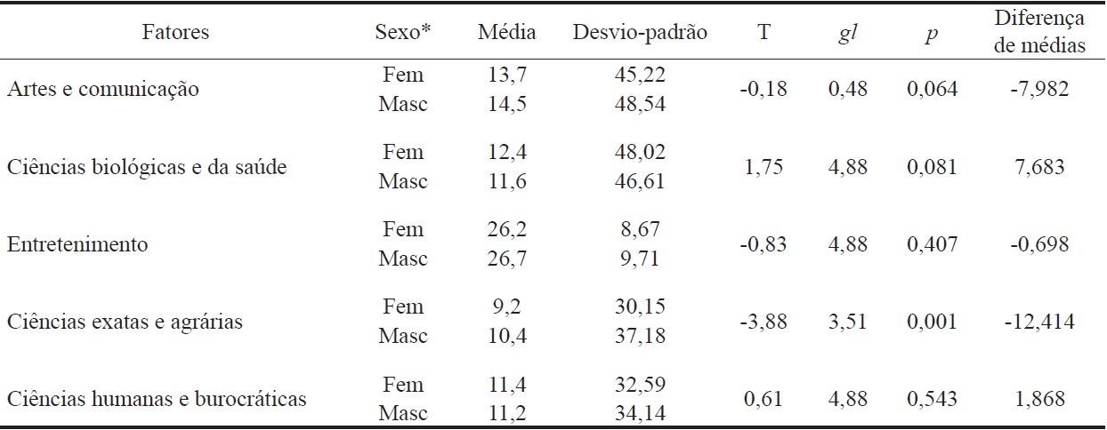 Esses achados convergem com os da pesquisa desenvolvida por Melo-Silva, Noce, & Andrade (2003), na qual foram apontadas diferenças de médias entre sexos a partir da aplicação do BBT-Br – Teste de Fotos de Profissões. Os resultados demonstraram que os homens privilegiaram o fator V, que indica a razão e a objetividade e tendência por profissões da área de Engenharia e Ciências Exatas como Matemática, Física e Estatística.