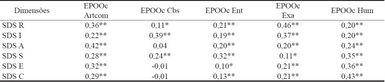 As análises seguintes estimaram os índices de correlação entre as tipologias Realista (R), Investigativo (I), Artístico (A), Social (S), Empreendedor (E) e Convencional (C) do SDS e as dimensões da EPOOc, a saber, Artes e Comunicação (ARTCOM), Ciências Biológicas e da Saúde (CBS), Entretenimento (ENT), Ciências Exatas e Agrárias (EXA), Ciências Humanas e Burocráticas (HUM). Foram encontradas correlações entre todas as dimensões da EPOOc e as tipologias do SDS, embora tenham sido eleitas para discussões mais aprofundadas, aquelas com maior significância. Aliás, esse foi o critério utilizado para a discussão das correlações, conforme os resultados visualizados na Tabela 3.