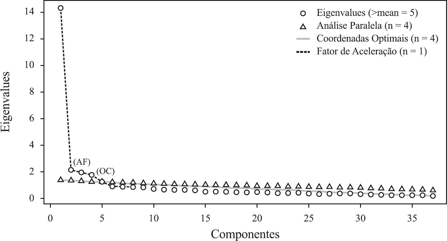 Procedeu-se, então, a extração dos quatro fatores sugeridos pelo critério da análise paralela, utilizando como método a fatoração de eixo principal e optando por utilizar o método de rotação Ortogonal Varimax. Essa rotação permite maior parcimônia nos dados da matriz resultante, de forma a agregar uma estrutura fatorial composta somente pelos itens que possuíam cargas fatoriais elevadas em cada dimensão da escala. Esse fator é importante no processo de desenvolvimento de medidas psicológicas, uma vez que favorece a replicação dos mesmos em estudos futuros (Costello & Osborne, 2005). Em seguida, decidiu-se pela exclusão de itens com cargas fatoriais inferiores a 0,3. Da mesma forma, em casos de itens com cargas fatoriais presentes em mais de um fator, o critério de exclusão anterior também foi aplicado quando o resultado da diferença entre as cargas fatoriais fosse inferior a 0,2 (Hair, Anderson, Tatham e Black, 2005). Desse modo, quando a diferença fosse maior, o item permaneceria retido no fator em que demonstrou maior carga fatorial. A estrutura fatorial resultante reteve 27 dos 37 itens iniciais, demonstrados na Tabela 2.