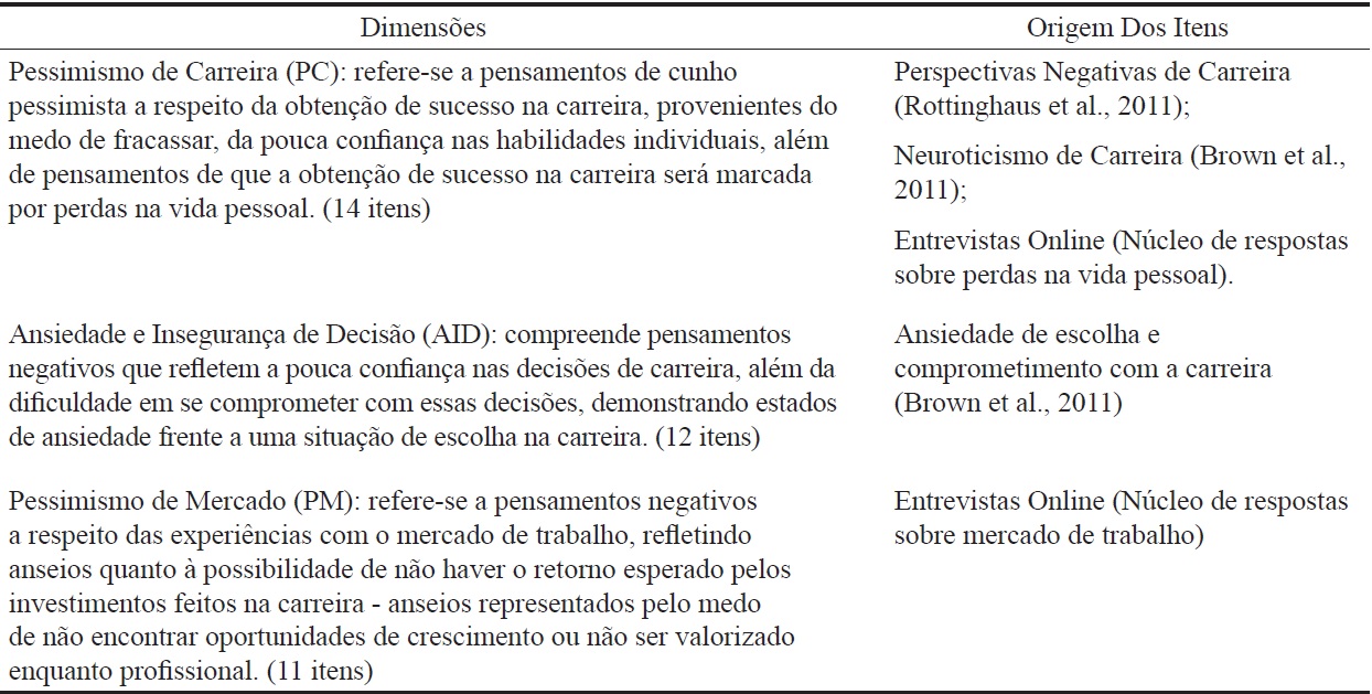 As dimensões e os itens da escala foram elaborados com base em duas fontes de dados. A primeira fonte utilizada foi o material oriundo da Escala de Quatro Fatores de Indecisão de Carreira desenvolvida por Brown et al. (2011) e o Inventário de Futuro de Carreira, desenvolvido por Rottinghaus, Buelow, Matyja, e Schneider (2011). Da escala proposta por Brown et al. (2011), foram utilizadas duas dimensões: (a) Neuroticismo de Carreira e (b) Ansiedade de escolha/comprometimento com a carreira. Ambos os fatores avaliavam pensamentos que refletem estados de pessimismo e ansiedade frente à carreira. Em relação ao inventário de Rottinghaus et al. (2011), foi utilizada a dimensão Perspectivas Negativas de Carreira, cujos itens refletiam pensamentos a respeito de insucesso profissional.