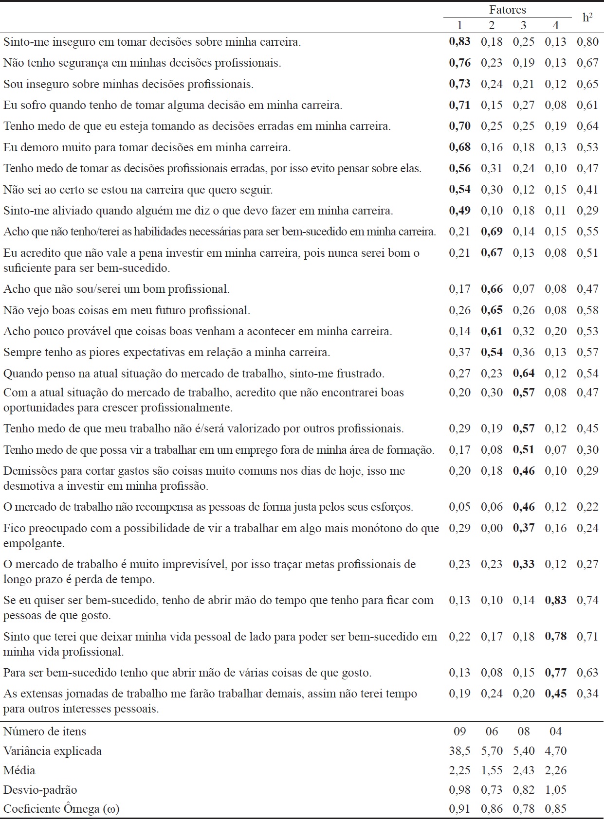 O quarto fator agrupou os itens desenvolvidos com base no segundo núcleo de conteúdo obtido na análise das entrevistas on-line. Esses itens inicialmente pertenciam ao fator Pessimismo de Carreira (PC) e representavam pensamentos negativos sobre os custos necessários para se alcançar o sucesso, refletindo estados de anseios a respeito de possíveis perdas na vida pessoal em detrimento da obtenção de um status profissional de sucesso (ex. As extensas jornadas de trabalho me farão trabalhar demais, assim não terei tempo para outros interesses pessoais). Dessa forma, esse novo fator foi nomeado de Custos para o Sucesso (CS), obtendo variância explicada no valor de 4,70% e coeficiente de precisão no valor de 0,85.