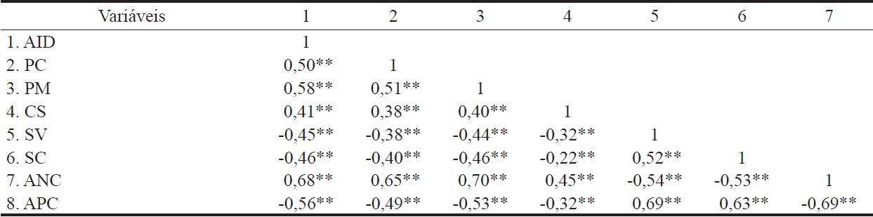 Nota-se que os resultados das correlações entre os construtos “satisfação com a carreira”, “satisfação com a vida”, “afetos positivos” e “afetos negativos de carreira” apresentaram lógica análoga aos resultados mencionados anteriormente. Correlações positivas foram encontradas entre os afetos positivos e os construtos “satisfação com a carreira” (r = 0,63; p < 0,001) e “satisfação com a vida” (r = 0,69; p < 0,001). De maneira oposta, os mesmos demonstraram correlações negativas com os afetos negativos de carreira (r = -0,53; p < 0,001) e (r = -0,54; p < 0,001). Os construtos “satisfação com a vida” e “satisfação com a carreira” também se apresentaram positivamente relacionados (r = 0,52; p < 0,001).