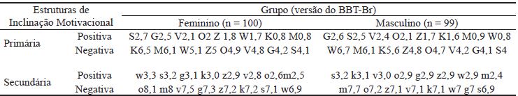 As estruturas de inclinação motivacional positiva e negativa (primária e secundária) foi elaborada para cada versão do BBT-Br. Esses dados compõem a Tabela 1.