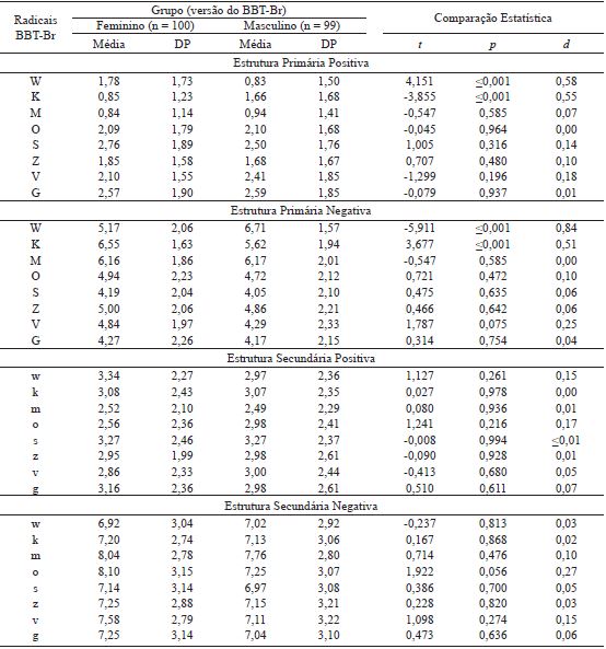 Foi, a seguir, realizada comparação estatística dos resultados médios da versão feminina e a masculina do BBT-Br em relação aos radicais primários e secundários (positivos e negativos) de inclinação motivacional. Esses dados são apresentados na Tabela 2.