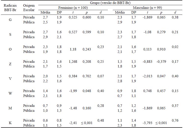 Na versão masculina do BBT-Br foram identificadas diferenças estatisticamente significativas em função da origem escolar nos radicais K (atividades com uso de força física e energia psíquica) e V (atividades com o uso da racionalidade, que trabalhem com mensuração) nas estruturas primárias positiva e negativa. Diante desses radicais os estudantes de escolas públicas obtiveram médias mais elevadas, com efeito da magnitude alto para o radical K (d = 0,76) e com efeito mediano para o radical V (d = 0,40). Esses dados reforçaram suas preferências por atividades vinculadas à força/energia vital e à racionalidade, em comparação com seus pares de escolas particulares, provavelmente derivadas das necessidades mais prementes de seu contexto de vida e socioeconômico, exigindo perfil mais assertivo para enfrentar os desafios de sua realidade.