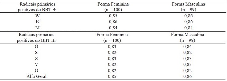 Por fim, para avaliar indicadores da precisão dos achados das duas formas do BBT-Br foi realizada análise de sua consistência interna. Para tanto, calculou-se o valor do Alfa de Cronbach para os radicais positivos ponderados da estrutura primária de inclinações motivacionais, cujos resultados compõem a Tabela 5.