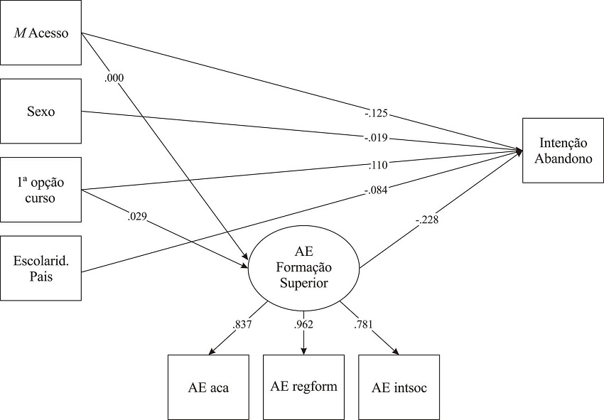 O sexo dos estudantes também está relacionado com a intenção de abandonar o ES (β = -.019), mas não está relacionado com os níveis de autoeficácia. Os estudantes do sexo masculino apresentam taxa superior da intenção de abandono. O mesmo acontece com as habilitações dos pais, que têm uma relação negativa com a intenção de abandono, ou seja, uma taxa superior de intenção de abandonar o ES ocorre nos estudantes provenientes de famílias com menor escolaridade. Por último, frequentar o curso de primeira opção é também importante para a intenção de abandono. Os estudantes que têm intenção de abandonar tendencialmente não frequentam um curso de primeira opção (β = -.019).