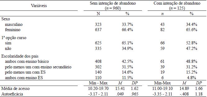 O estudo foi realizado recorrendo a uma amostra de 1085 estudantes do 1.º ano do ES, sendo que 125 (11.5%) mencionaram a intenção de abandonar o ES no momento em que estes dados foram recolhidos (6ª - 8ª semanas após o início das aulas). Na Tabela 1 descrevemos os estudantes diferenciando os resultados de acordo com terem ou não intenção de abandono. De referir que a pontuação global (nota Z) na Escala de Autoeficácia na Formação Académica decorre da variável latente estimada a partir dos resultados nas três dimensões da escala.