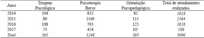 Considerando o total de vagas oferecidas anualmente para os estudantes dos sete cursos da Faculdade pública em questão, tem-se 1530 alunos matriculados. Analisando a demanda por atendimentos nas referidas modalidades (triagem, psicoterapia breve e orientação psicopedagógica) oferecidas pelo CAEP nos últimos quatro anos, registrou-se que, em média, 11% da população de estudantes procuraram o serviço e foram atendidos por seus profissionais. A tabela 2 apresenta o número de graduandos que espontaneamente buscou apoio às suas demandas individuais, no período de 2014 a 2017.