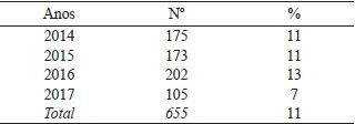 A seguir, será apresentada a Tabela 1, que descreve o número de atendimentos realizados em cada modalidade descrita acima entre os anos 2014 a 2017.