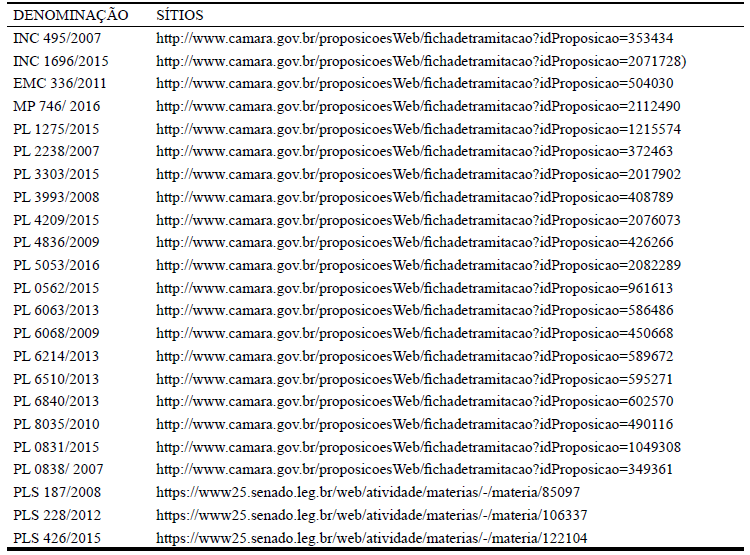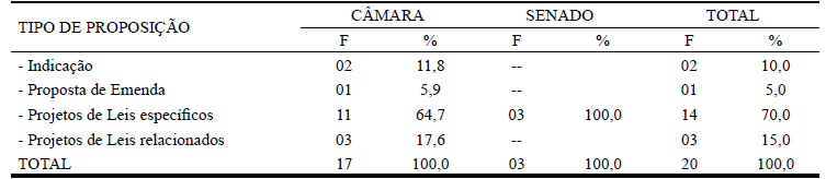 No âmbito do Congresso Nacional (Câmara dos Deputados e Senado) foram encontradas vinte proposições legislativas no período de 2007 a 2018. Destas, 17 referem-se a propostas da Câmara dos Deputados, sendo catorze Projetos de Lei (PLs), duas Indicações e uma proposta de Emenda para a Comissão (EMC). A Indicação é o documento legislativo que visa sugerir a outro poder que adote providências ou que uma ou mais Comissões se manifestem sobre determinado assunto. A Tabela 1 mostra o número de proposições legislativas contabilizadas nos sítios da Câmara Federal e do Senado.
