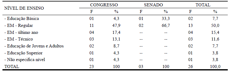No que tange ao público-alvo segundo o nível de ensino, as propostas diferem, ora sendo muito abrangentes, ora muito restritivas. Assim, algumas propostas estabelecem as ações que deveriam ser aplicadas ao ensino médio, ao ensino técnico profissional, à educação de jovens e adultos e à educação superior, “presencial e a distância”; outras são bem mais restritas, estabelecendo a obrigatoriedade apenas à última série do ensino médio. Como se pode observar na Tabela 3, metade das propostas se destinaram ao ensino médio regular, subentendendo-se que as ações devam ocorrer desde as séries iniciais desta etapa. Entretanto, o último ano do ensino médio é citado em 15% das proposições legislativas, revelando a concepção de ajuda ao aluno no momento da escolha de um curso superior, reforçando a ideia de um trabalho voltado predominantemente para este fim.